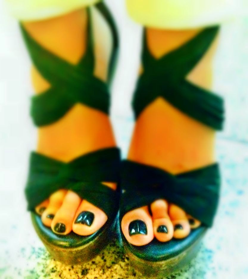nunca tinha feito antes: pintar as unhas dos meus ricos pezinhos de preto brilhante.
